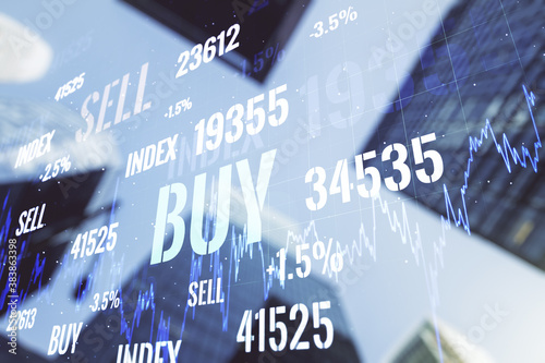 Double exposure of abstract financial chart on office buildings background, research and analytics concept