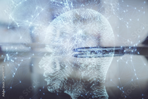 Double exposure of Ai data brain drawing over coffee cup background.