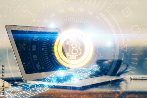 Double exposure of blockchain theme hologram and table with computer background. Concept of bitcoin crypto currency.