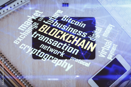 Double exposure of blockchain theme hologram over table with phone. Top view. Crypto technology concept.