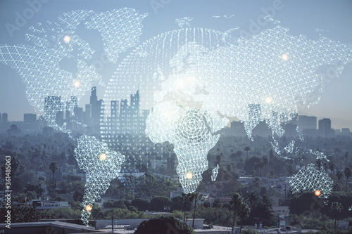 Double exposure of business theme hologram drawing and city veiw background. Concept of success.