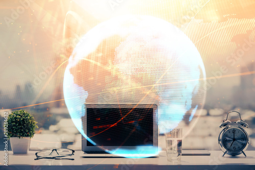 Double exposure of business theme icons and work space with computer background. Concept of success.