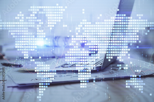Double exposure of business theme icons and work space with computer background. Concept of success.