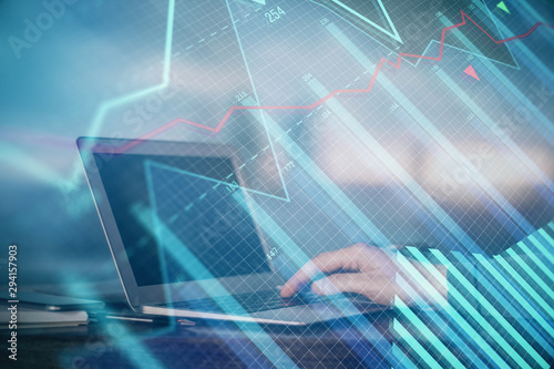 Double exposure of businessman's hands with laptop and stock market graph background. Concept of research and trading.