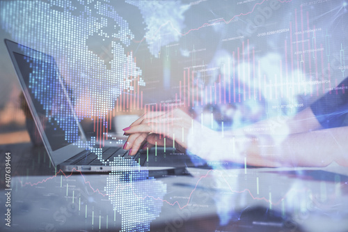 Double exposure of businesswoman hands typing on computer and forex chart hologram drawing. Financial analysis concept.
