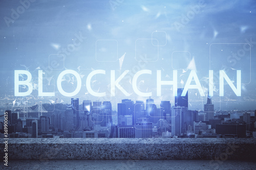 Double exposure of crypto currency theme hologram drawing and city veiw background. Concept of blockchain and bitcoin.