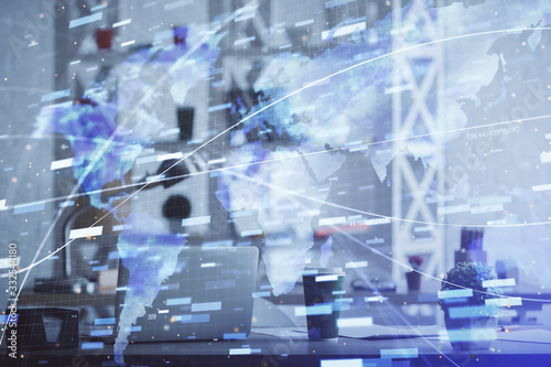 Double exposure of data theme drawing and office interior background. Concept of technology.
