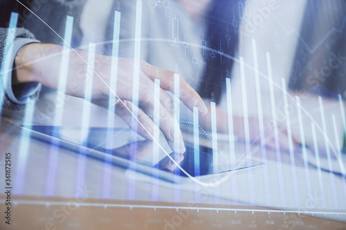Double exposure of forex graph drawing and man and woman working together holding and using a mobile device. Trade concept.