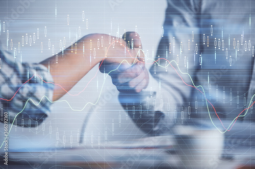 Double exposure of forex graph hologram and handshake of two men. Stock market concept.