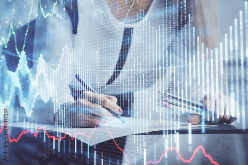 Double exposure of hands making notes with forex chart huds. Stock market concept.
