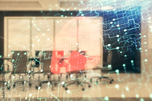 Double exposure of lock icon hologram on conference room background. Concept of cyber security