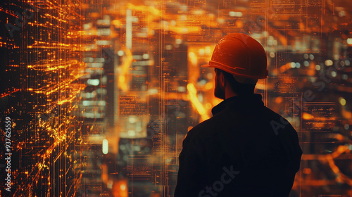 Double exposure of male engineer in hard hat and looking at city. Big city illustration. Buildings and idea of future city construction. Wide sunset effect. Text space