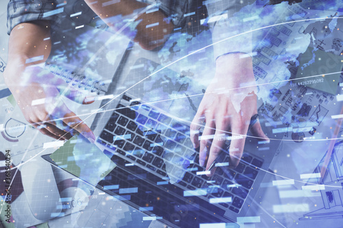 Double exposure of man and woman working together and data theme hologram drawing. Computer background. Top View.
