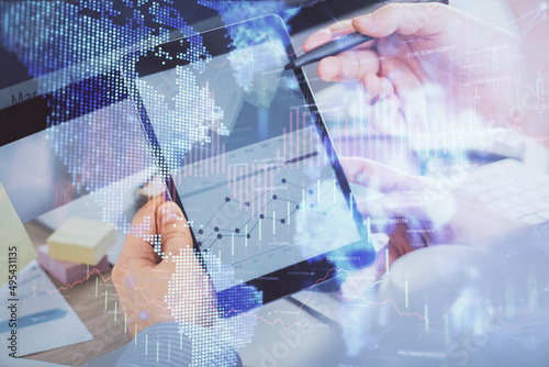 Double exposure of man's hands holding and using a phone and financial chart drawing. Market analysis concept.