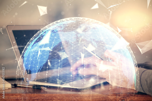 Double exposure of man's hands holding and using a phone and international business theme drawing.