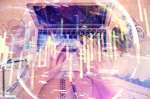 Double exposure of man's hands typing over computer keyboard and business theme hologram drawing. Top view. Financial markets concept.