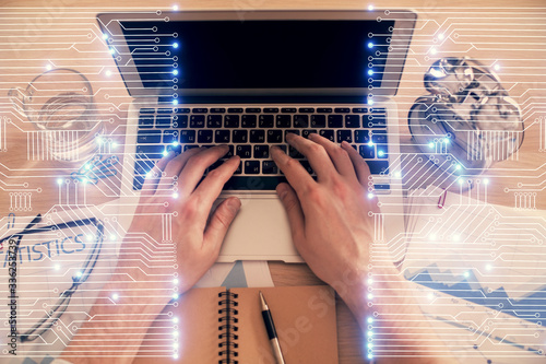 Double exposure of man's hands typing over computer keyboard and tech theme hologram drawing. Top view. Technology concept.