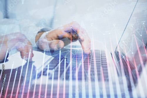 Double exposure of market chart with man working on computer on background. Concept of financial analysis.