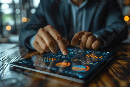 Double exposure of People in business are studying and working on the analytics to forecast stock market behavior. CEO with hands crossed in front view