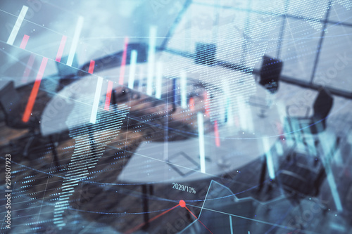 Double exposure of stock market graph with globe hologram on conference room background. Concept of international finance