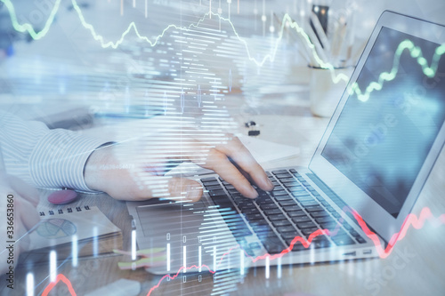 Double exposure of stock market graph with man working on laptop on background. Concept of financial analysis.