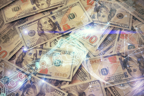 Double exposure of tech theme drawing over usa dollars bill background. Concept of technology.