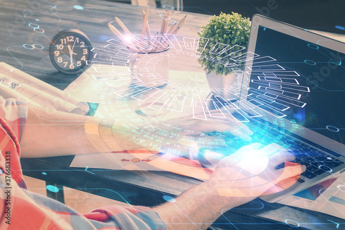 Double exposure of technology hologram with man working on computer background. Concept of big data.
