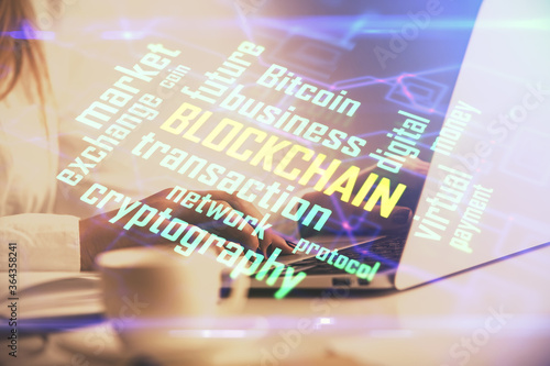 Double exposure of woman hands typing on computer and crypto market theme hologram drawing. Blockchain concept.