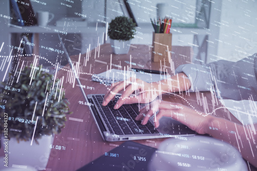 Double exposure of woman hands typing on computer and forex chart hologram drawing. Stock market invest concept.