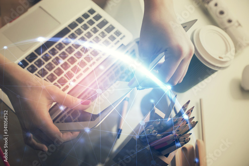 Double exposure of woman hands typing on computer and social network theme hologram drawing. People media concept.