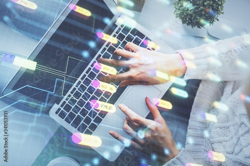 Double exposure of woman hands working on computer and data theme hologram drawing. Top View. Technology concept.