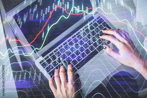 Double exposure of woman hands working on computer and forex chart hologram drawing. Top View. Financial analysis concept.