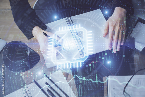Double exposure of writing hands on background with data solution hologram on front. Technology concept. Close up