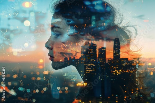 Double exposure of young woman and building exterior. Neural network ai generated art