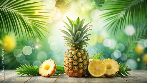 Double Exposure Pineapple: Fresh Slices & Tropical Leaves on White Background