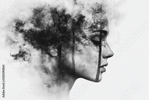 Double Exposure Portrait Combining Woman's Profile with Forest Trees