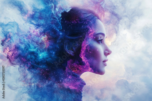 Double exposure portrait of a woman blending with a vibrant space nebula, featuring swirling galaxies and stars in a cosmic surrealism style. A mystical connection to the universe