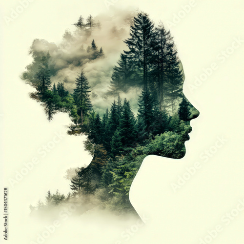 Double exposure silhouette of woman with forest to symbolize eco consciousness