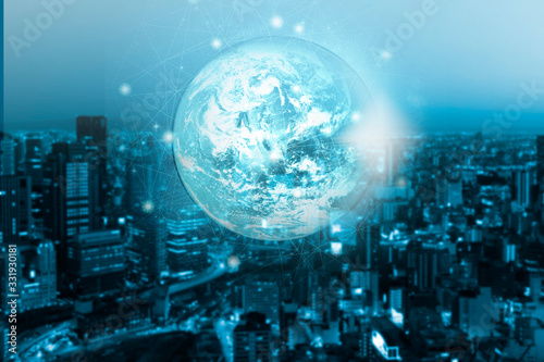Double exposure technology global network connection and communications concept on city background. Element of this images furnished by NASA.