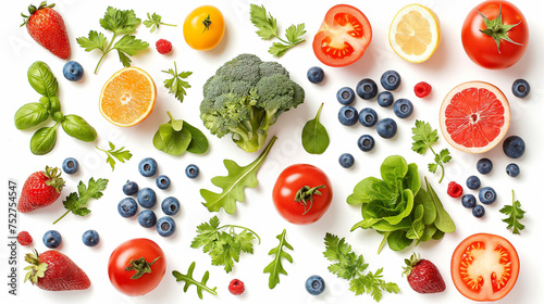 Double pattern of fresh vegetables, fruits and berries isolated on white background.