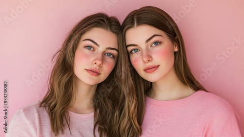 Double the Charm - Twin Young Women Posed Together Against a Plain Pink Background, Looking at the Camera with Smiles