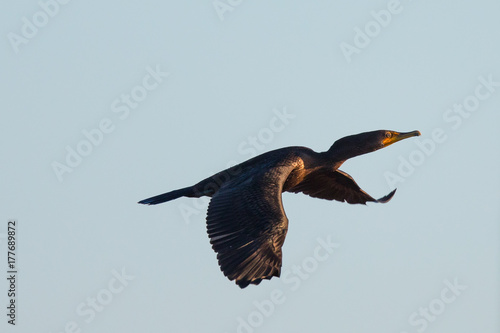Double-crested cormorant flying in North California in the golden sunset light