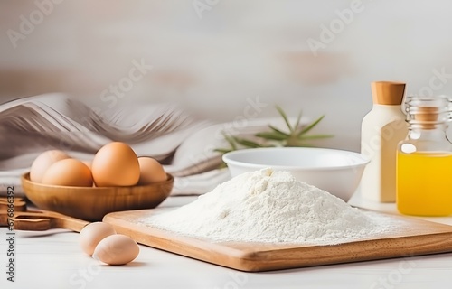 dough, eggs and flour cooking on white wooden plate on white wooden table soft light