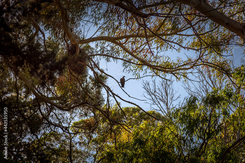 Dove standing quietly on a tree branch, surrounded by leaves on a sunny day