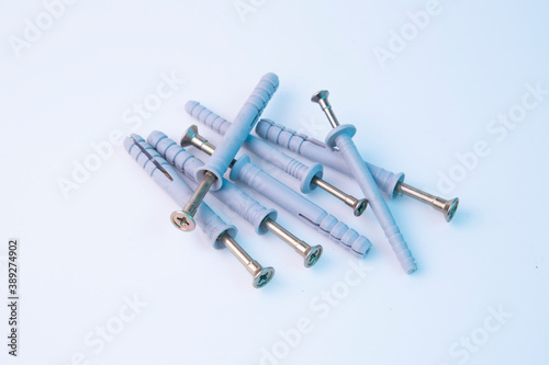 Dowel with self-tapping screws on a white background.Tools for construction work.