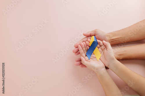 Down Syndrome awareness shown with hands holding a yellow-blue ribbon on pink background. Supporting Autism Awareness and celebrating Down Syndrome Day