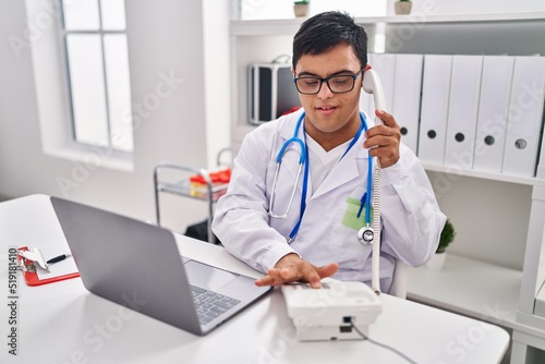 Down syndrome man wearing doctor uniform talking on the telephone at clinic