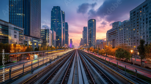 Downtown train tracks at sunset
