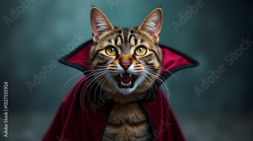 Dracula Cat Portrait - Funny Brown Tabby Vampire with Cape and Fangs - Halloween Pet Costume Image