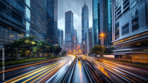 Drag racing car speeding through a city with towering skyscrapers. Featuring technology and energy